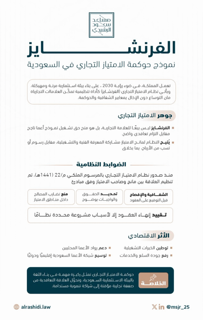 وفي ضوء التوجه الوطني نحو بناء بيئة استثمارية مرنة ومستدامة، يُعدّ نظام “الفرنشايز” أحد الركائز الأساسية لتنظيم العلامات التجارية وضمان التوسع الآمن للأنشطة الاقتصادية داخل المملكة، مع الالتزام بمعايير الحوكمة والإفصاح.
