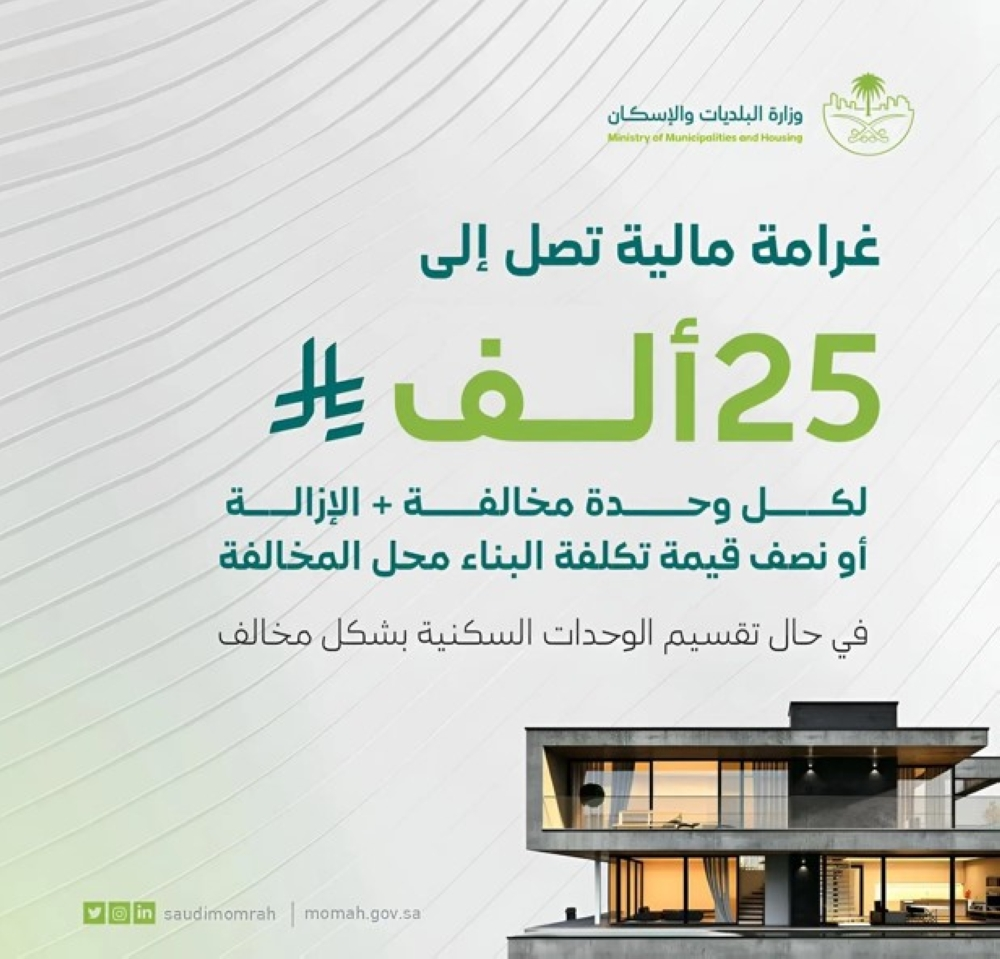 أوضحت الوزارة أن الغرامة المالية للمباني المخالفة تتراوح بين 5 آلاف و25 ألف ريال لكل وحدة، مع إلزام المالك أو المستثمر بإزالة المخالفة على نفقته الخاصة.