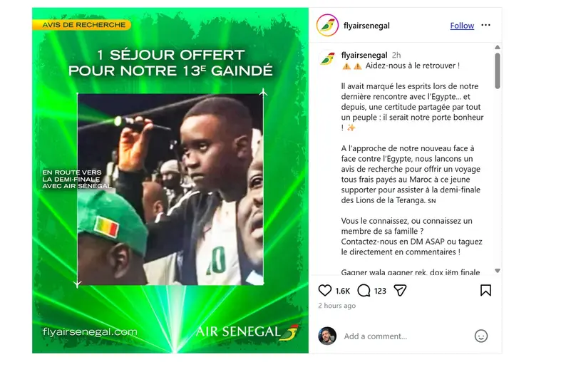ونشرت شركة الطيران السنغالية صورة للمشجع عبر حساباتها الرسمية، معلقة: “ساعدونا في العثور عليه، لقد ترك انطباعًا لا يُنسى خلال مباراتنا الأخيرة ضد مصر، ومنذ ذلك الحين باتت قناعة راسخة لدى الجميع أنه جلب لنا الحظ”.